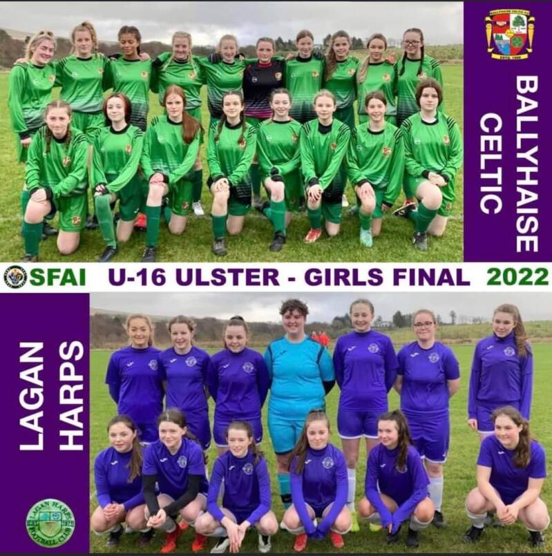 U16 Ulster Final v Ballyhaise Celtic. Below are team photos and captain Sarah Conaghan receiving the cup.