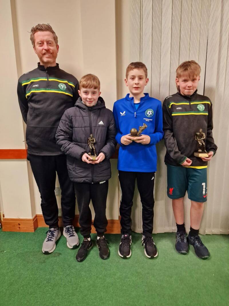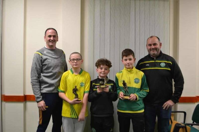 10/11/23. U12A coach Seamus Harkin with award winners. Players player of the year: Shay Tourish. Top scorer: Daimhin Harkin. Player of the year: Kayden Mc Bride.